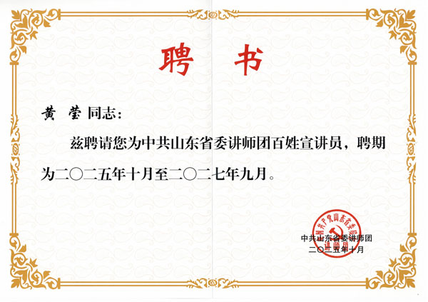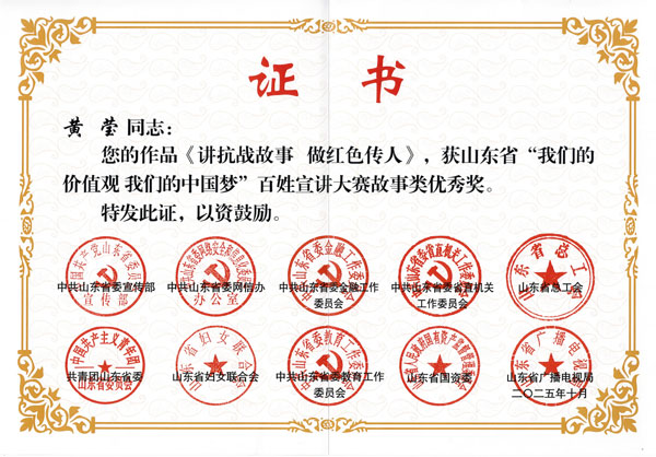 喜报!黄莹同志参加山东省“我们的价值观 我们的中国梦”百姓宣讲大赛喜获优秀奖