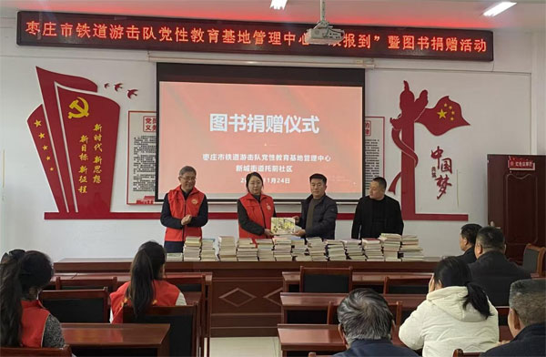 2025年11月24日上午,枣庄市铁道游击队党性教育基地管理中心组织志愿者服务队,在管理中心副主任孙中启带领下,来到新城街道托前社区开展“双报到”暨图书捐赠活动。