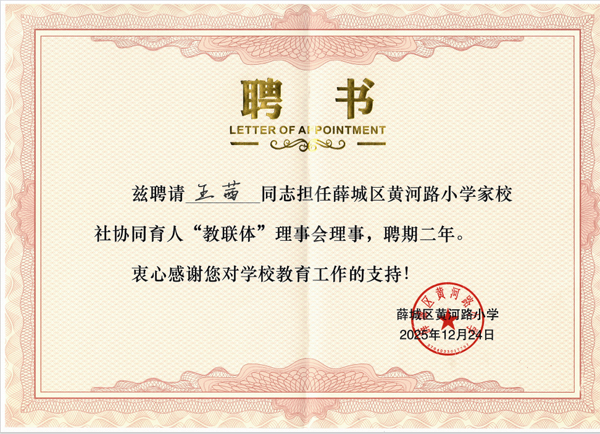王茜同志被聘为薛城区黄河路小学家校社协同育人“教联体”理事会理事